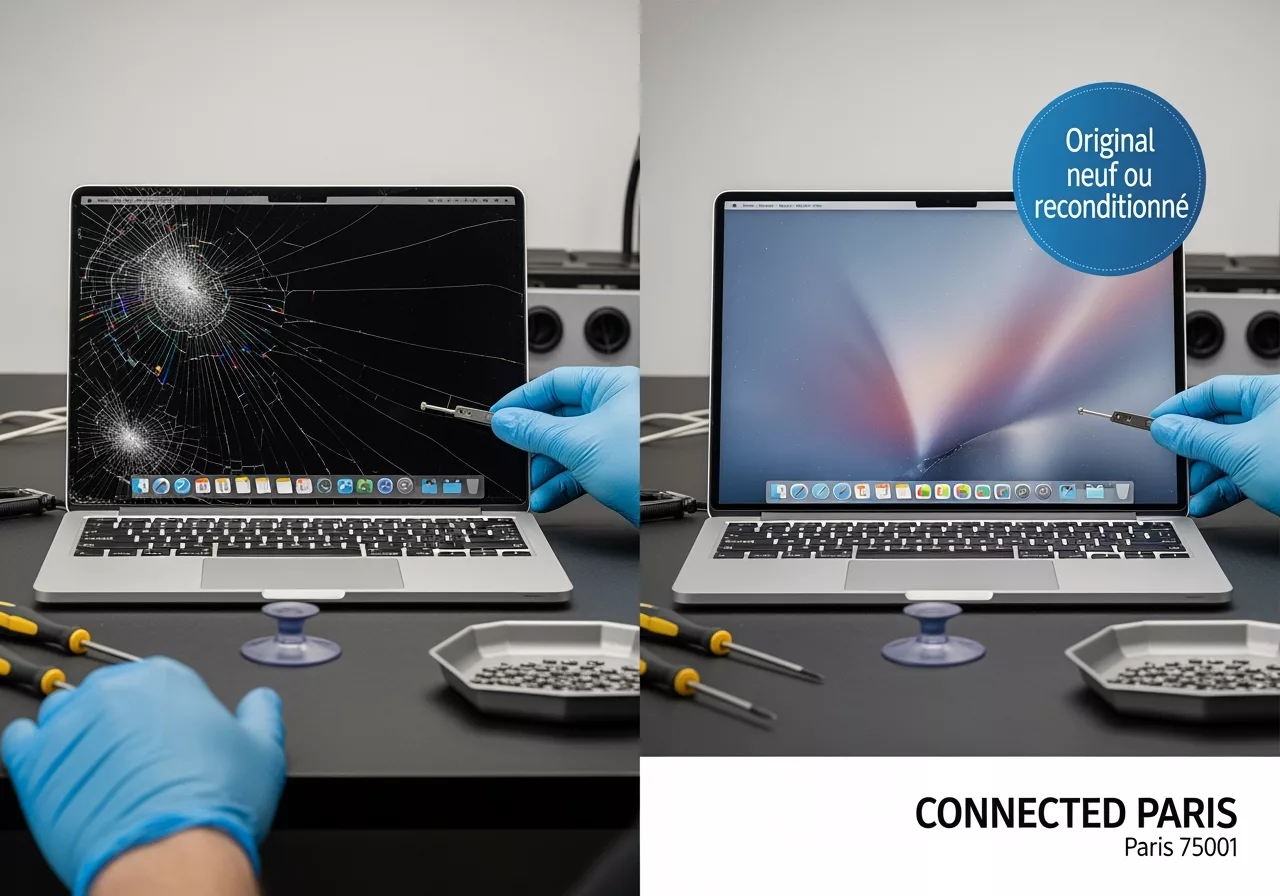 Votre MacBook Air A1466 a l’écran fissuré, des lignes ou ne s’allume plus ? Connected Paris remplace votre écran A1466 rapidement, avec pièces Apple originales au choix: écran neuf ou reconditionné contrôlé. Diagnostic express, devis clair, intervention soignée par techniciens certifiés.